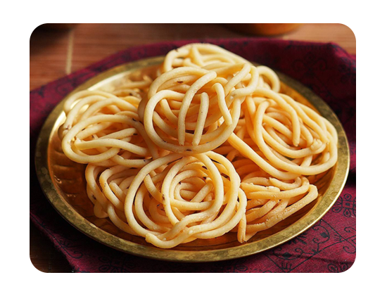 Murukku is a traditional South Indian deep-fried snack made primarily from rice flour and urad dal flour. Crunchy and lightly spiced, it is shaped into spirals using a murukku press and enjoyed with tea or during festivals like Diwali and Krishna Jayanthi. The name “Murukku” means “twisted” in Tamil, referring to its beautiful coiled shape.